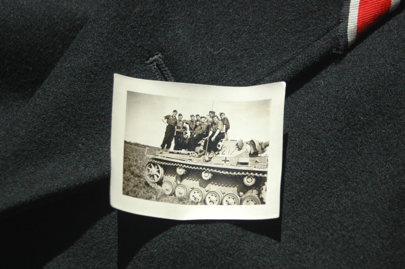 1/16/2026: Just listed a fantastic Army panzer wrapper. This one is in excellent condition and is for a tank driver. Very unique to find a driver and this wrapper has the drivers merit badge on the sleeve in Bronze. This one has not been messed with, everyhting is original to it. The best part was in the inside pocket was found a small period photo which shows a panzer crew and a few others. Most likely the wearer of this wrapper is in that photo!